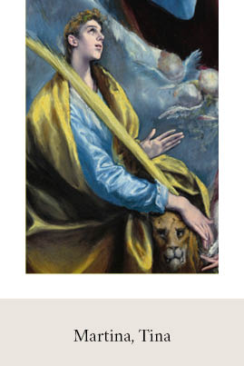 Der Name "Martina" ist die weibliche Form des lateinischen Namens "Martinus" (dem Kriegsgott Mars gehörig) und könnte als "die Kriegerin" übersetzt werden. Der Name ist in den meisten Sprachen verbreitet, manchmal in etwas anderen Formen wie Martine (französisch) oder Martyna (polnisch). Beliebt sind auch die Kurzformen Tina oder Tine.