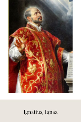 Der Name „Ignatius“ geht auf den etruskischen Geschlechternamen „Egantius“ zurück. Im Frühchristentum wurde er in „Ignatius“ geändert, was an das lateinische Wort für Feuer (ignis) erinnert. Damit kann er mit „der Feurige“ übersetzt werden. Auf Deutsch ist der Name als „Ignaz“ verbreitet.