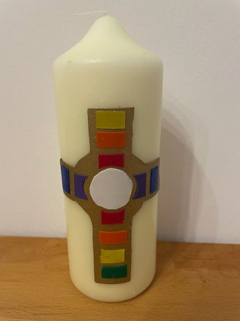 Gedanken zum Motiv der Osterkerze: "Die hellen Farben des Regenbogens im Längsbalken des Kreuzes verbinden Gott mit uns Menschen. Die dunklen Farben im Querbalken verbinden uns Menschen miteinander. Beide Balken werden durch das Geschenk der Eucharistie zusammengehalten."